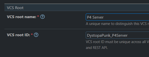 For VCS Root Name I’ll simply enter P4 Server and you can see the VCS Root ID automatically prepends the project name, like so: