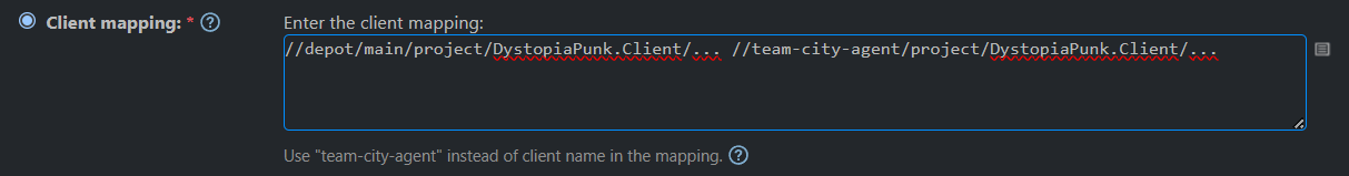 What this says is that I’m going to grab everything in my depot under project/DystopiaPunk.Client and map it into a local workspace for the team-city-agent in the same relative path. If there were other folders that I needed to map I could duplicate this line and update them accordingly.